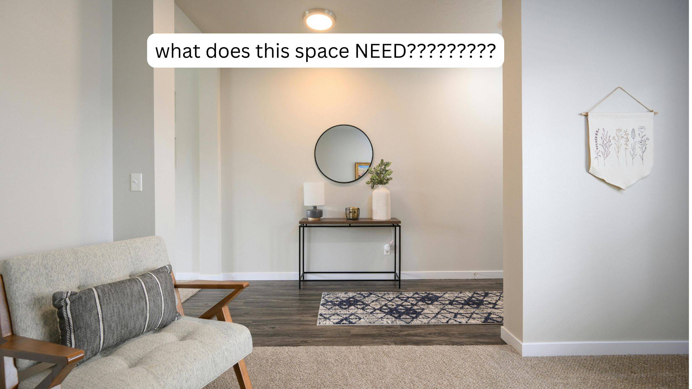 The rooms are all a version of greige - and need some contrast - maybe a larger, vertical black framed art print instead of that wall hanging?